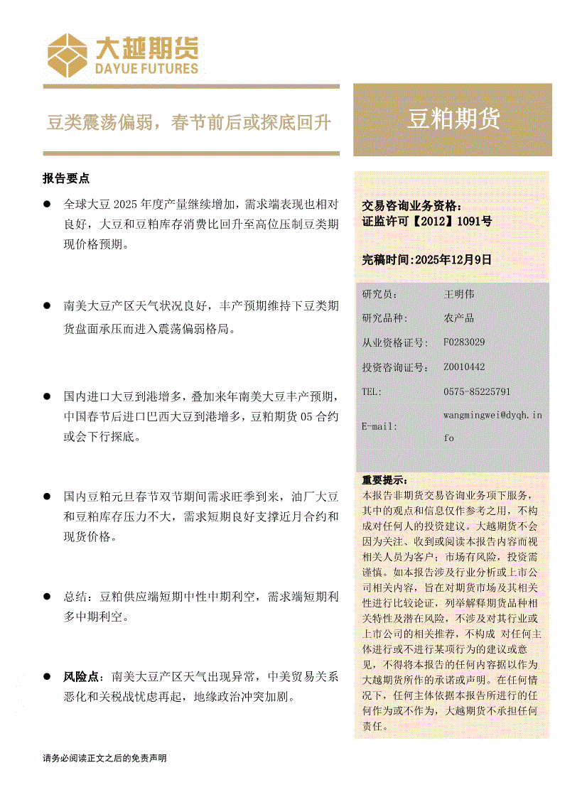 大越期货-豆粕期货:豆类震荡偏弱,春节前后或探底回升-251209