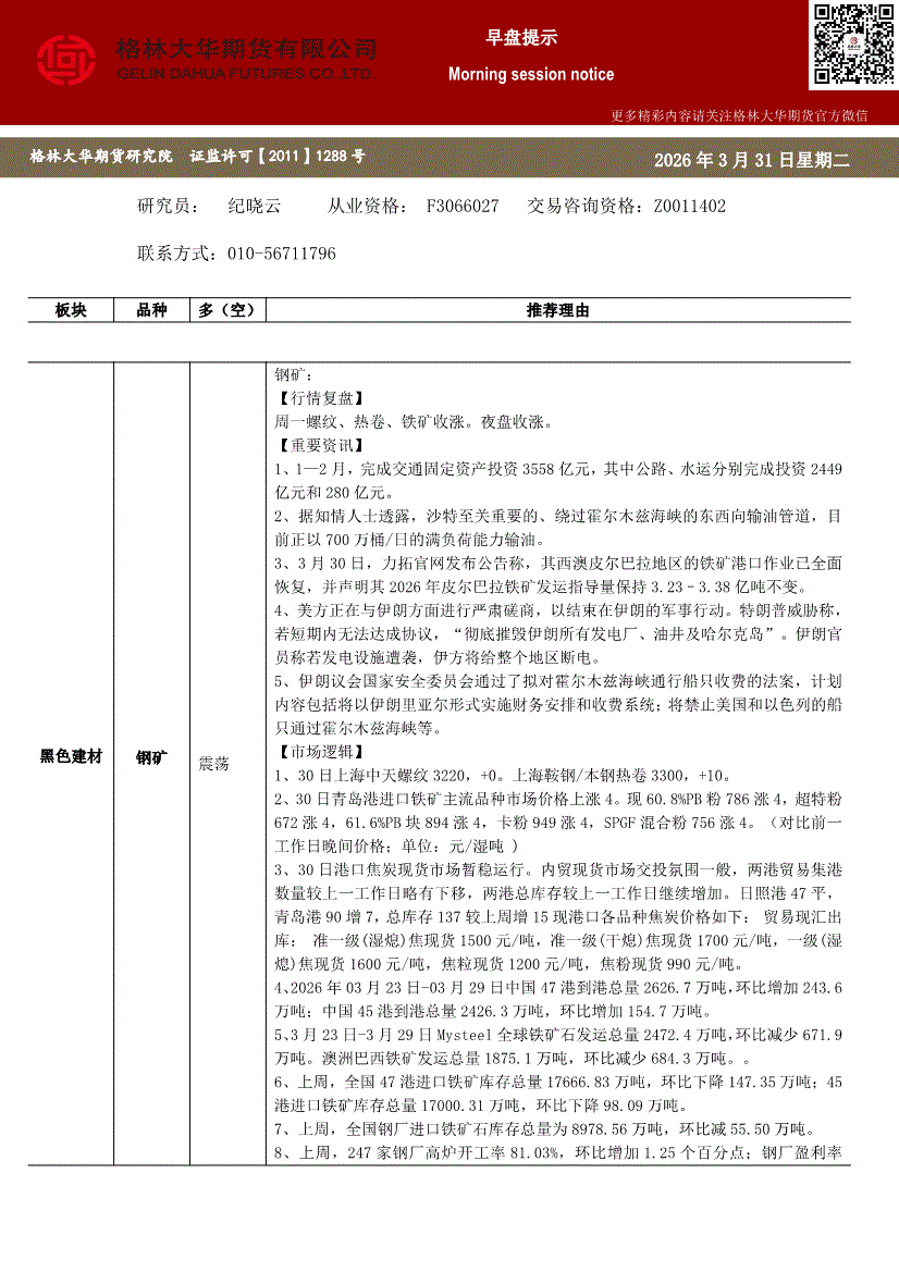 格林大华期货-早盘提示:钢矿-260331
