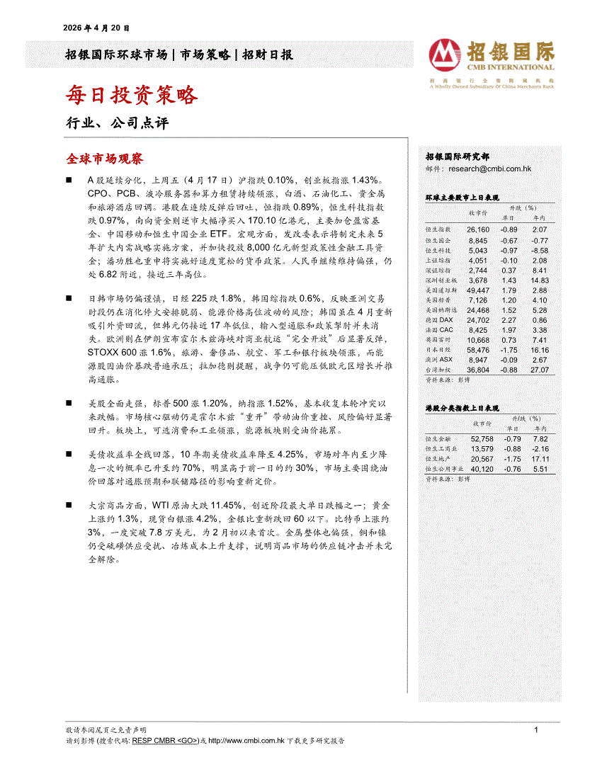 招银国际-招财日报:每日投资策略-260420