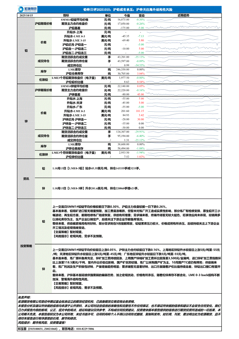 宏源期货-铅锌日评:沪铅或有承压;沪锌关注海外结构性风险-251015