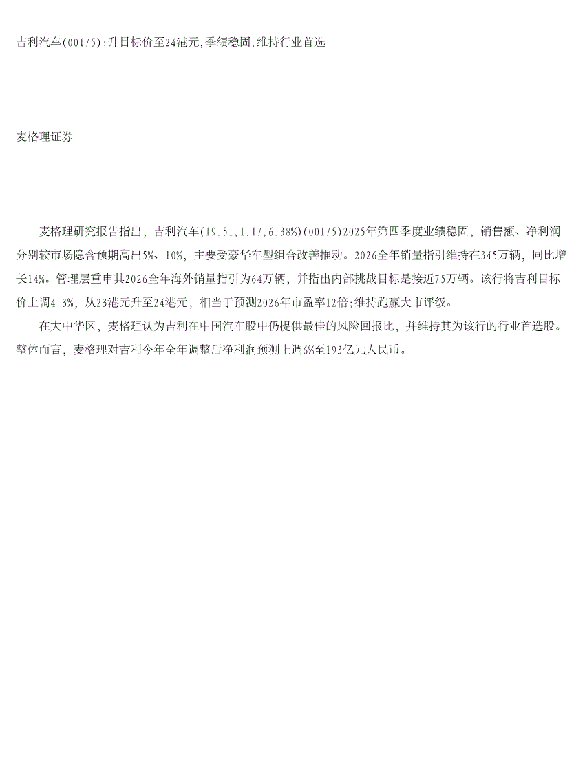吉利汽车:麦格理证券-吉利汽车-0175.HK-升目标价至24港元,季绩稳固,维持行业首选-260320