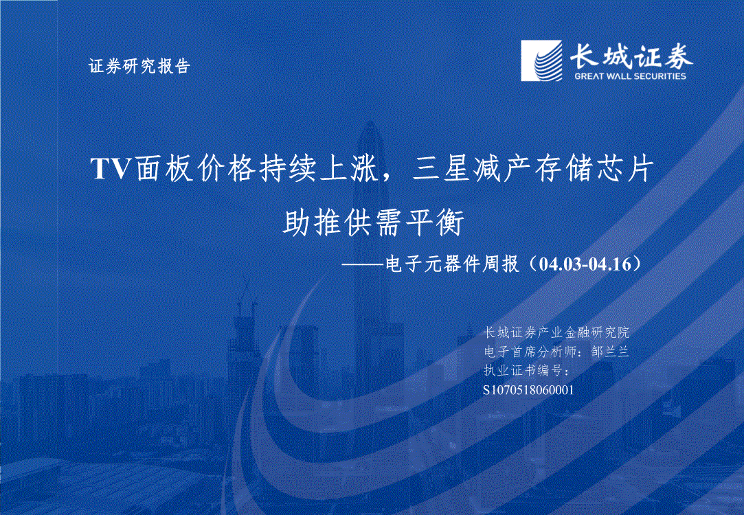 电子元器件行业:长城证券-电子元器件行业周报:TV面板价格持续上涨,三星减产存储芯片助推供需平衡-230416
