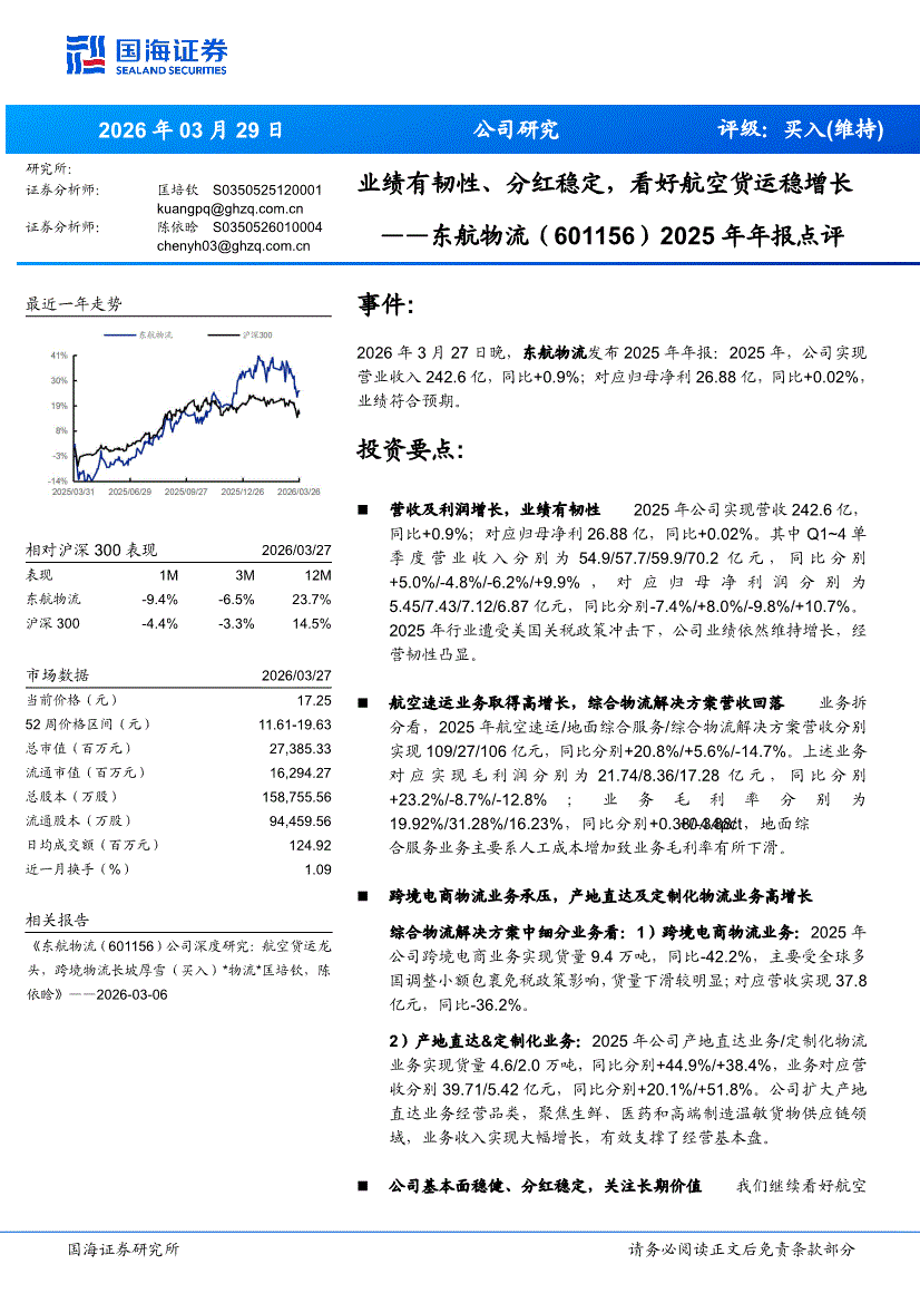 东航物流:国海证券-东航物流-601156-2025年年报点评:业绩有韧性、分红稳定,看好航空货运稳增长-260329