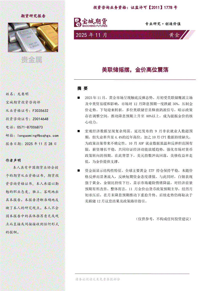 宝城期货-黄金月报:美联储摇摆,金价高位震荡-251128