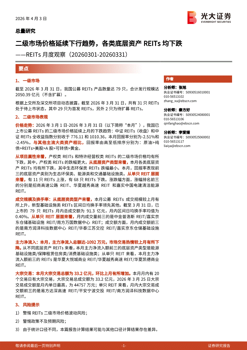 光大证券-REITs月度观察:二级市场价格延续下行趋势,各类底层资产REITs均下跌-260403
