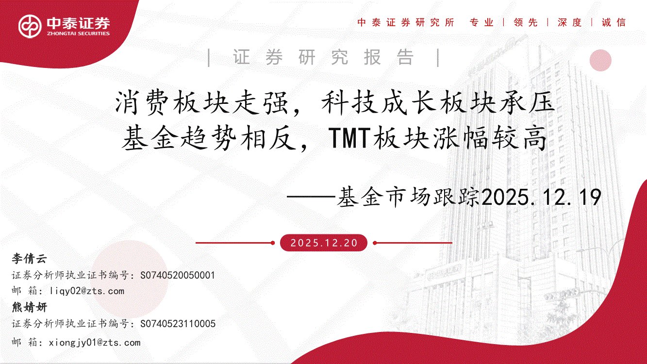 中泰证券-基金市场跟踪:消费板块走强,科技成长板块承压基金趋势相反,TMT板块涨幅较高-251220