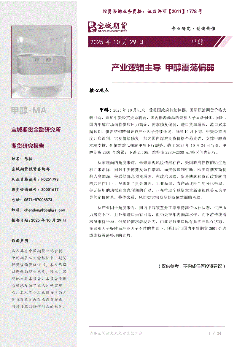 宝城期货-甲醇月报:产业逻辑主导,甲醇震荡偏弱-251029