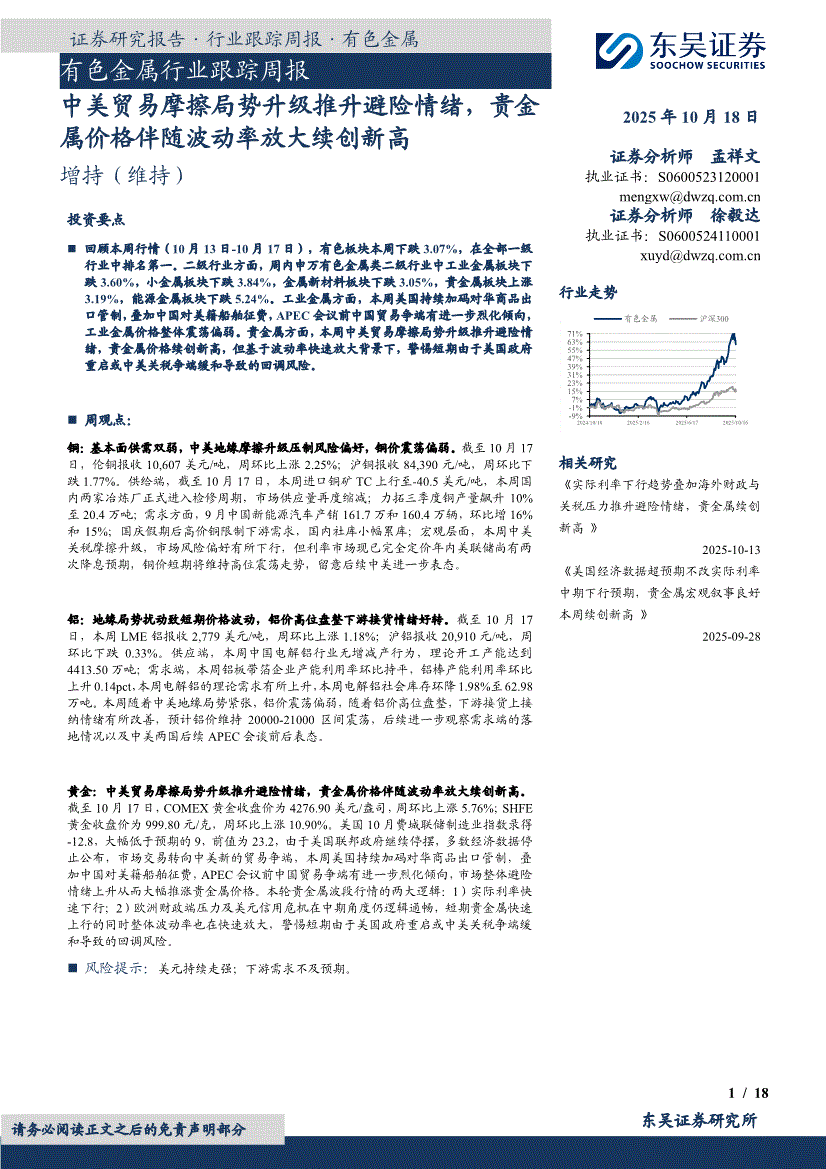 有色金属行业:东吴证券-有色金属行业跟踪周报:中美贸易摩擦局势升级推升避险情绪,贵金属价格伴随波动率放大续创新高-251018