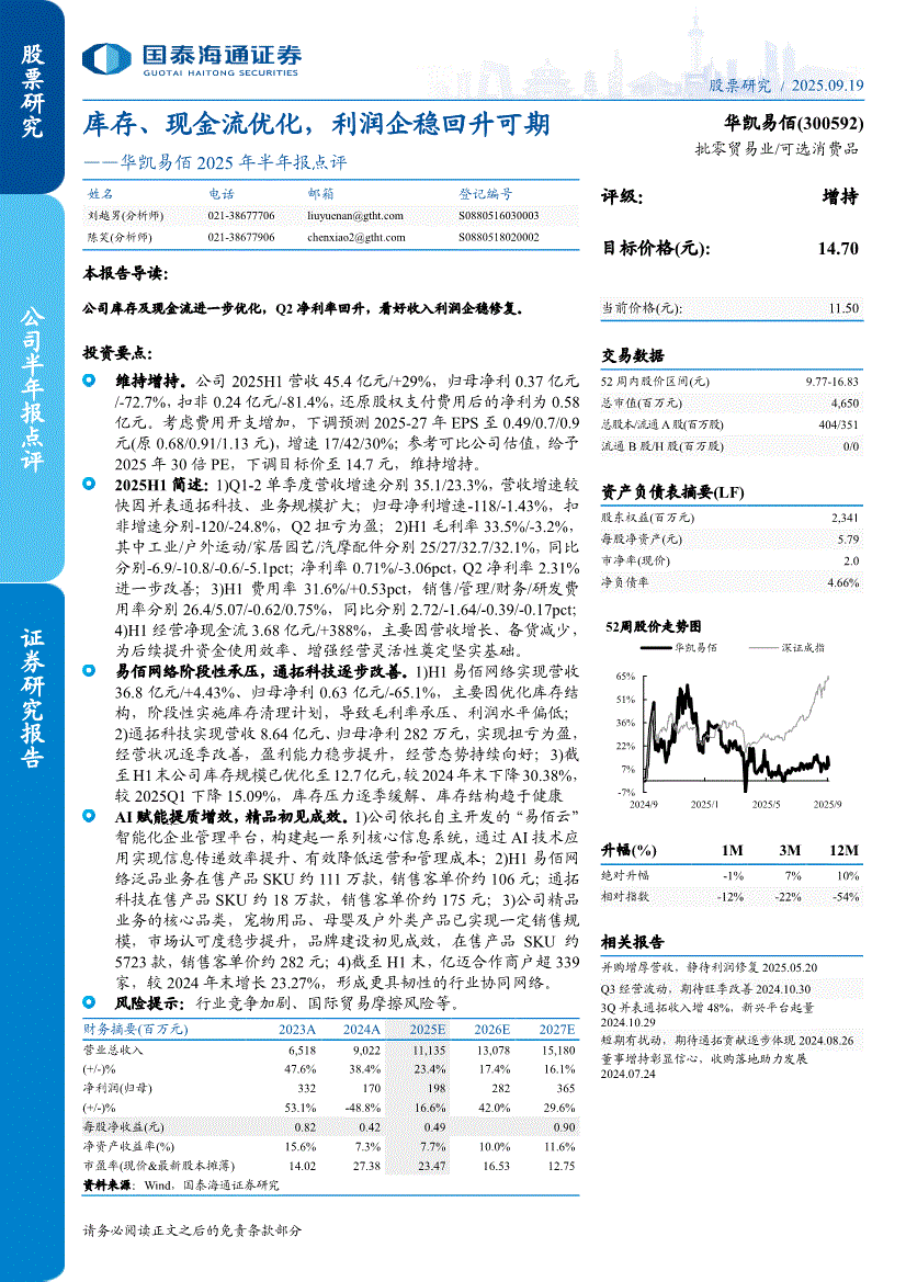 华凯易佰:国泰海通证券-华凯易佰-300592-2025年半年报点评:库存、现金流优化,利润企稳回升可期-250919