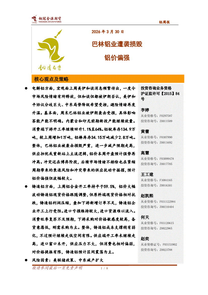 铜冠金源期货-铝周报:巴林铝业遭袭损毁,铝价偏强-260330