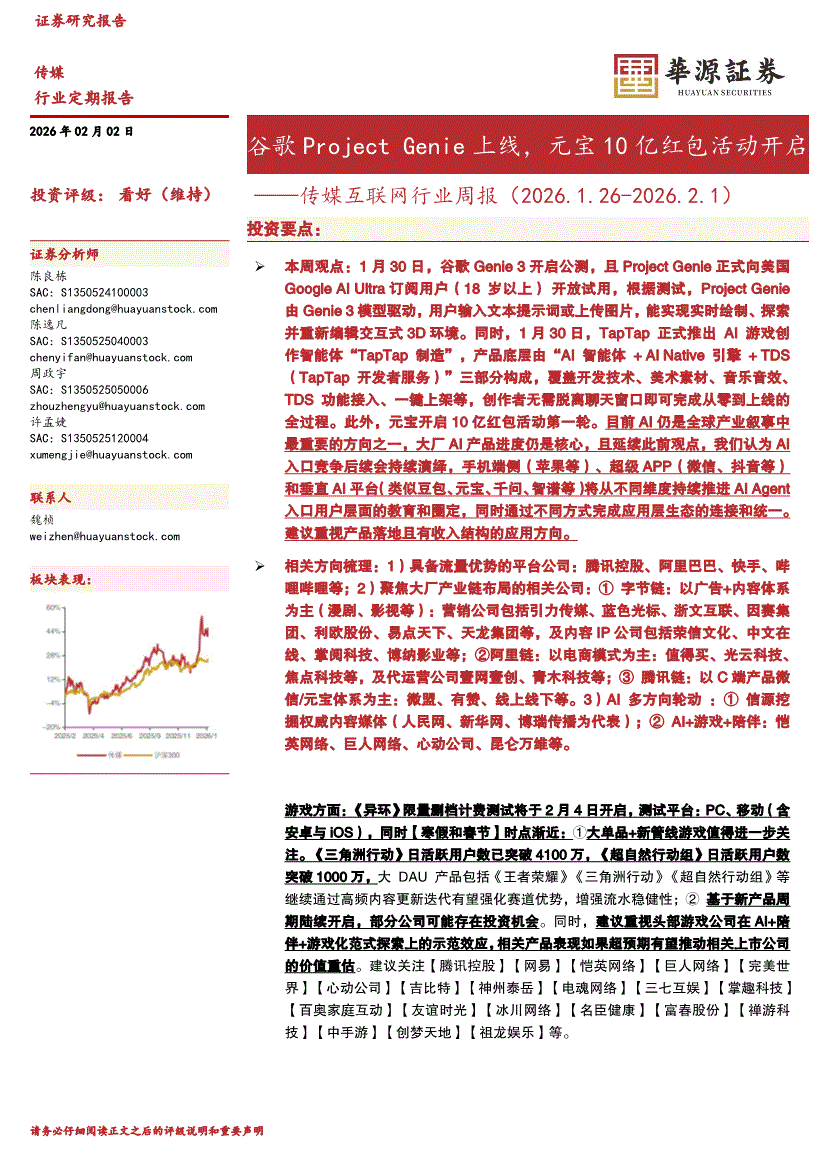传媒互联网行业:华源证券-传媒互联网行业周报:谷歌Project Genie上线,元宝10亿红包活动开启-260202