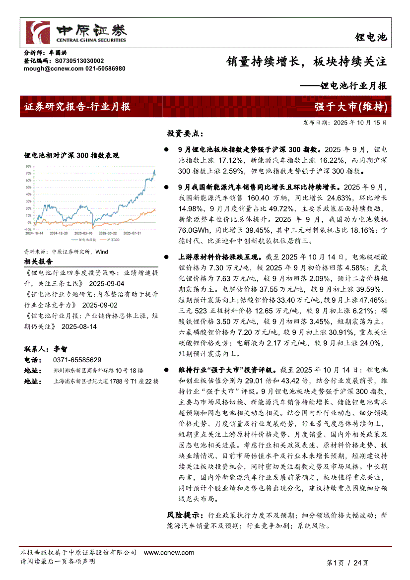 锂电池行业:中原证券-锂电池行业月报:销量持续增长,板块持续关注-251015