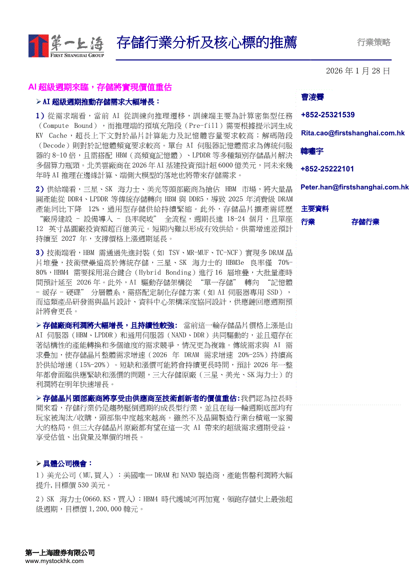 存储行业:第一上海-存储行业分析及核心标的推荐:AI超级周期来临,存储将实现价值重估-260128