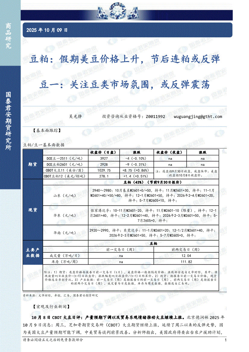 国泰君安期货-豆粕:假期美豆价格上升,节后豆粕或反弹,豆一,关注豆类市场氛围,或反弹震荡-251009
