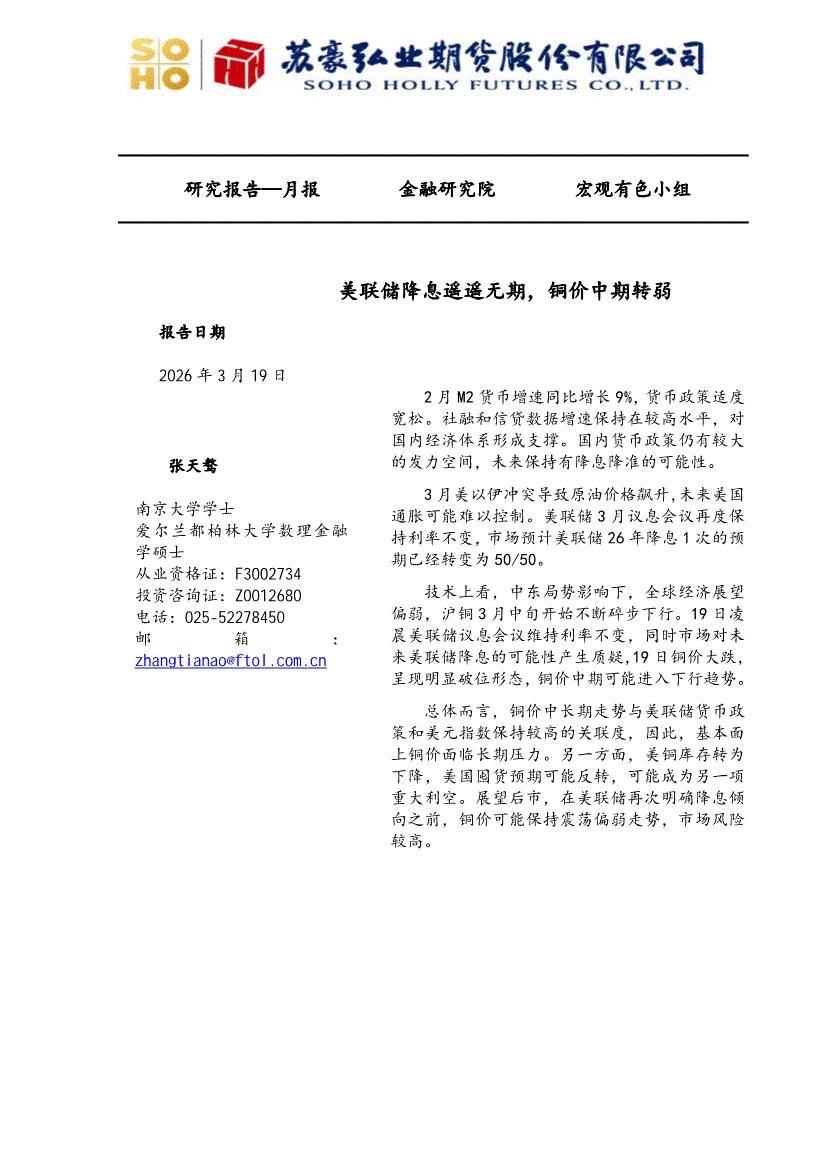 弘业期货-美联储降息遥遥无期,铜价中期转弱-260319