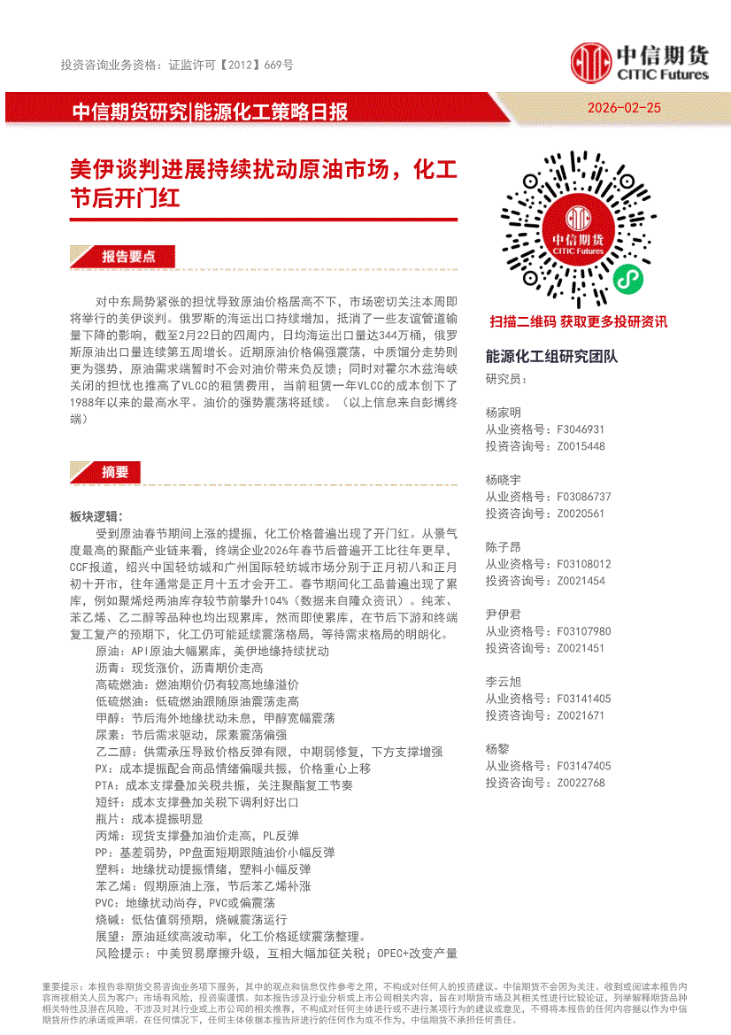 中信期货-能源化工策略日报:美伊谈判进展持续扰动原油市场,化工节后开门红-260225