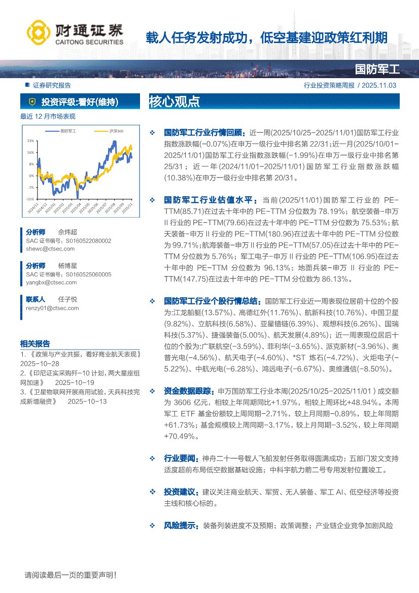 国防军工行业:财通证券-国防军工行业:载人任务发射成功,低空基建迎政策红利期-251103