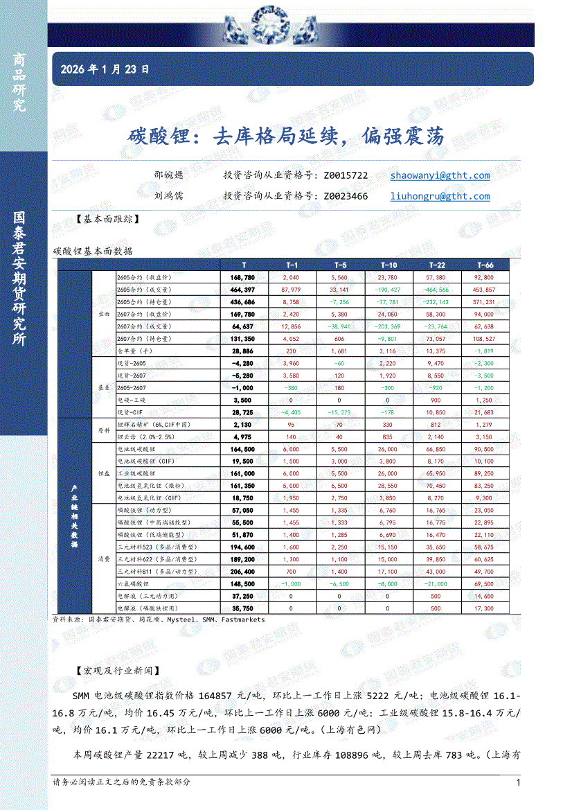 国泰君安期货-碳酸锂:去库格局延续,偏强震荡-260123