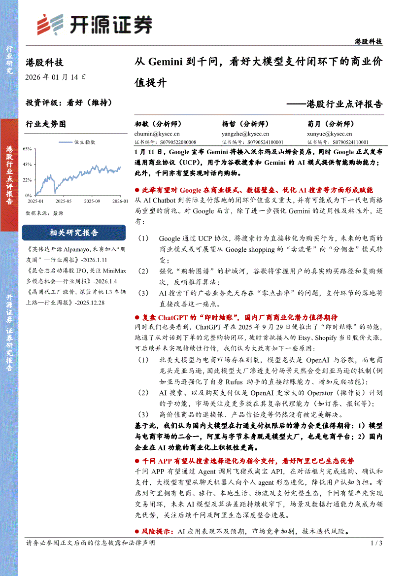 科技行业:开源证券-港股科技行业点评报告:从Gemini到千问,看好大模型支付闭环下的商业价值提升-260114