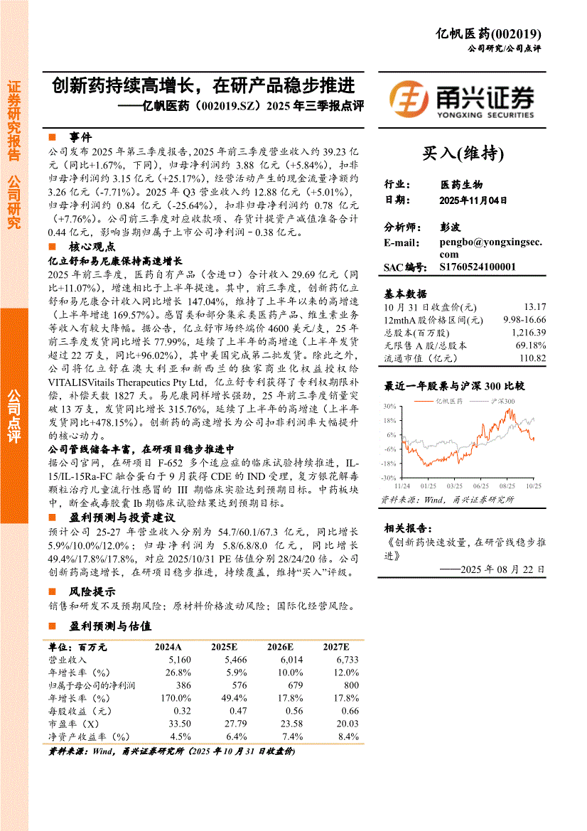 亿帆医药:甬兴证券-亿帆医药-002019-2025年三季报点评:创新药持续高增长,在研产品稳步推进-251104