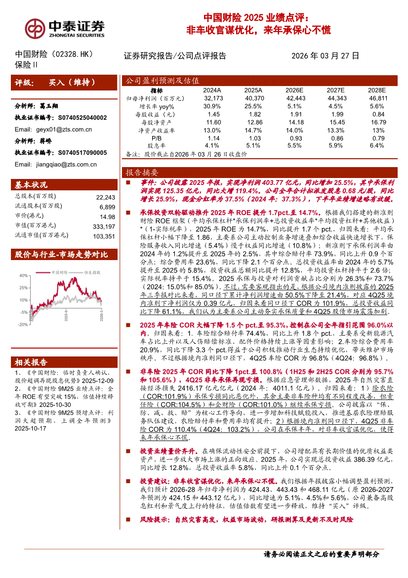 中国财险:中泰证券-中国财险-2328.HK-2025业绩点评:非车收官谋优化,来年承保心不慌-260327