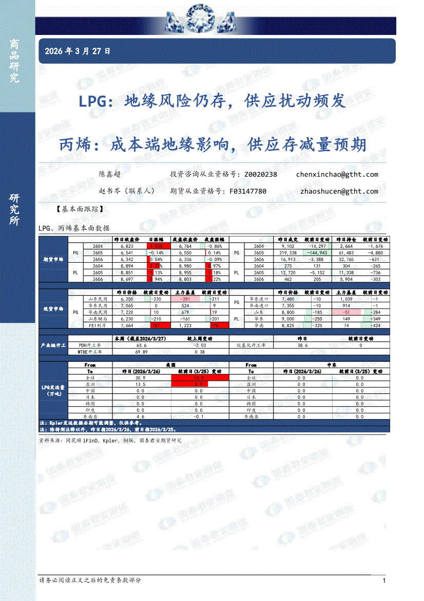 国泰君安期货-LPG:地缘风险仍存,供应扰动频发,丙烯,成本端地缘影响,供应存减量预期-260327
