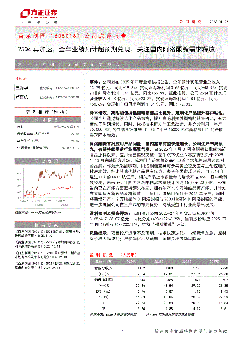 百龙创园:方正证券-百龙创园-605016-公司点评报告:25Q4再加速,全年业绩预计超预期兑现,关注国内阿洛酮糖需求释放-260122