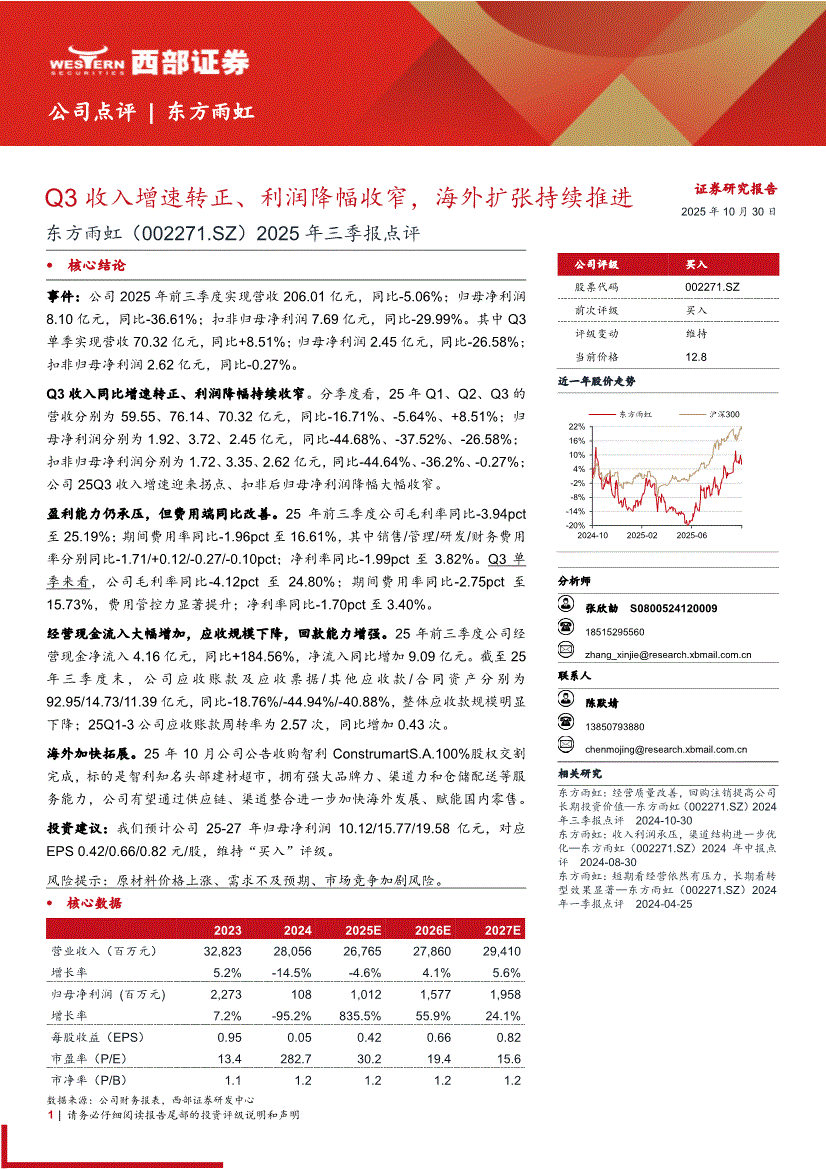 东方雨虹:西部证券-东方雨虹-002271-2025年三季报点评:Q3收入增速转正、利润降幅收窄,海外扩张持续推进-251030