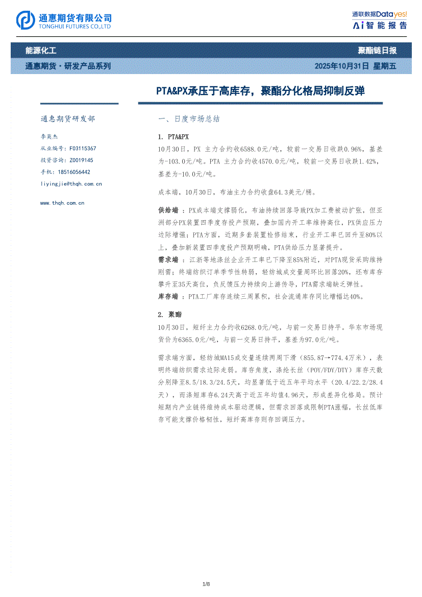 通惠期货-聚酯链日报:PTA&PX承压于高库存,聚酯分化格局抑制反弹-251031