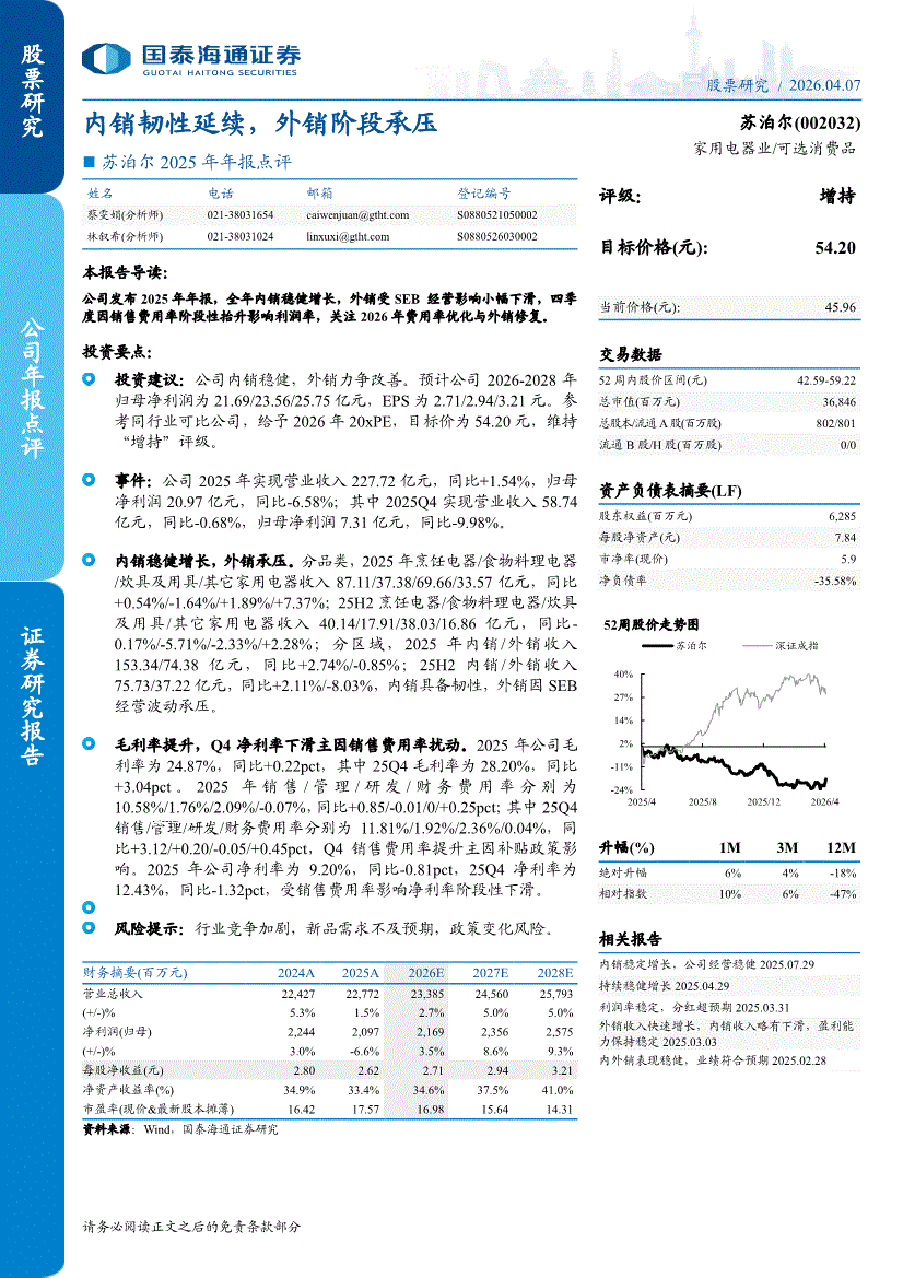 苏泊尔:国泰海通证券-苏泊尔-002032-2025年年报点评:内销韧性延续,外销阶段承压-260407