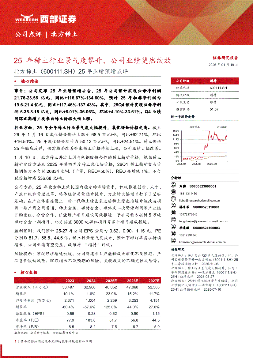 北方稀土:西部证券-北方稀土-600111-25年业绩预增点评:25年稀土行业景气度攀升,公司业绩斐然绽放-260119