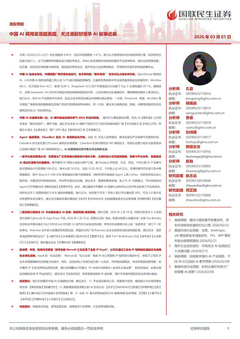 国联民生证券-港股周报:中国AI调用量首超美国,关注港股财报季AI叙事进展-260301