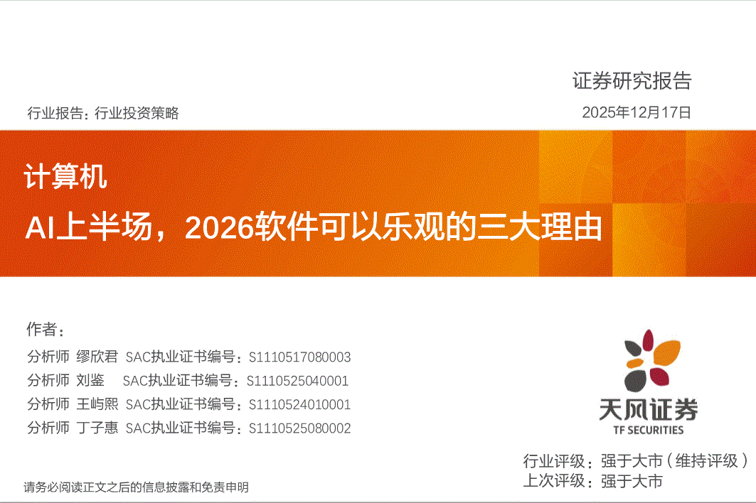 计算机行业:天风证券-计算机行业投资策略:AI上半场,2026软件可以乐观的三大理由-251217