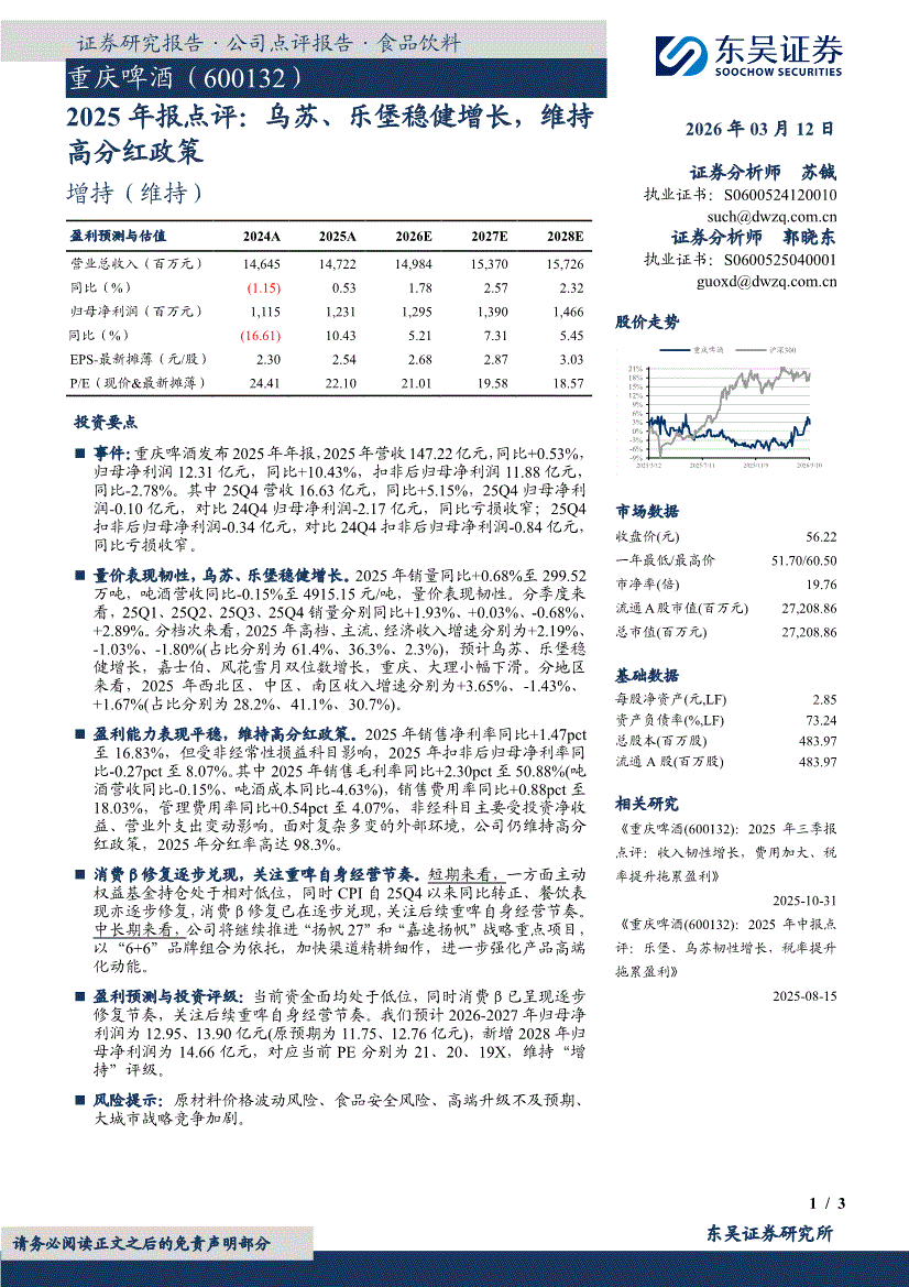 重庆啤酒:东吴证券-重庆啤酒-600132-2025年报点评:乌苏、乐堡稳健增长,维持高分红政策-260312