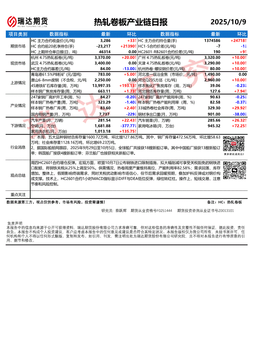瑞达期货-热轧卷板市场周报:产量维持高位,热卷期价反弹承压-251010