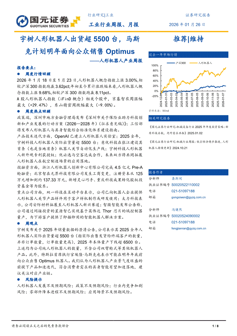 人形机器人行业:国元证券-人形机器人行业产业周报:宇树人形机器人出货超5500台,马斯克计划明年面向公众销售Optimus-260126