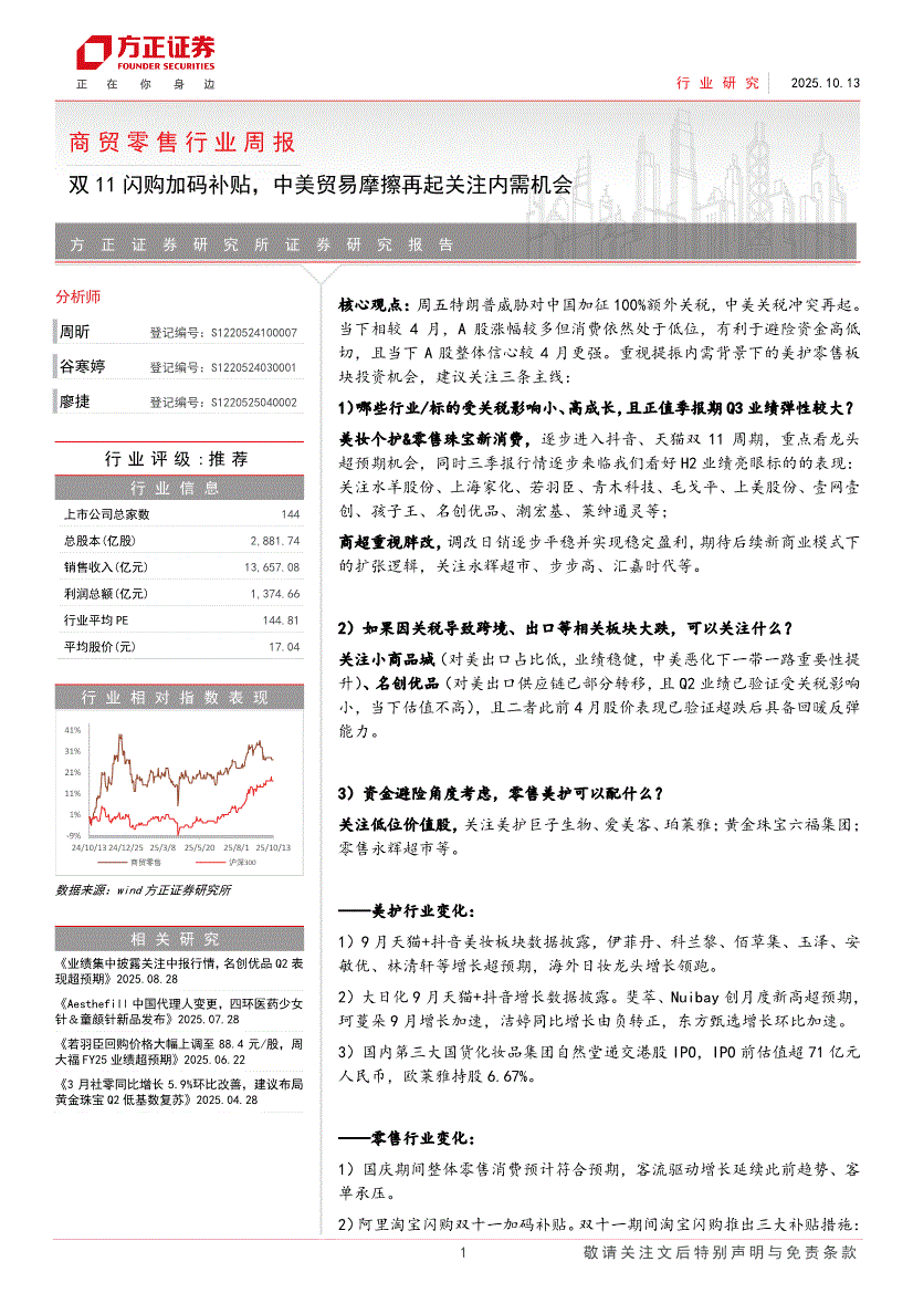 商贸零售行业:方正证券-商贸零售行业周报:双11闪购加码补贴,中美贸易摩擦再起关注内需机会-251013