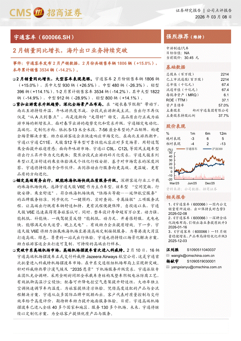 宇通客车:招商证券-宇通客车-600066-2月销量同比增长,海外出口业务持续突破-260308