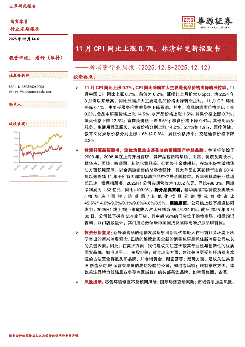 新消费行业:华源证券-新消费行业周报:11月CPI同比上涨0.7%,林清轩更新招股书-251214