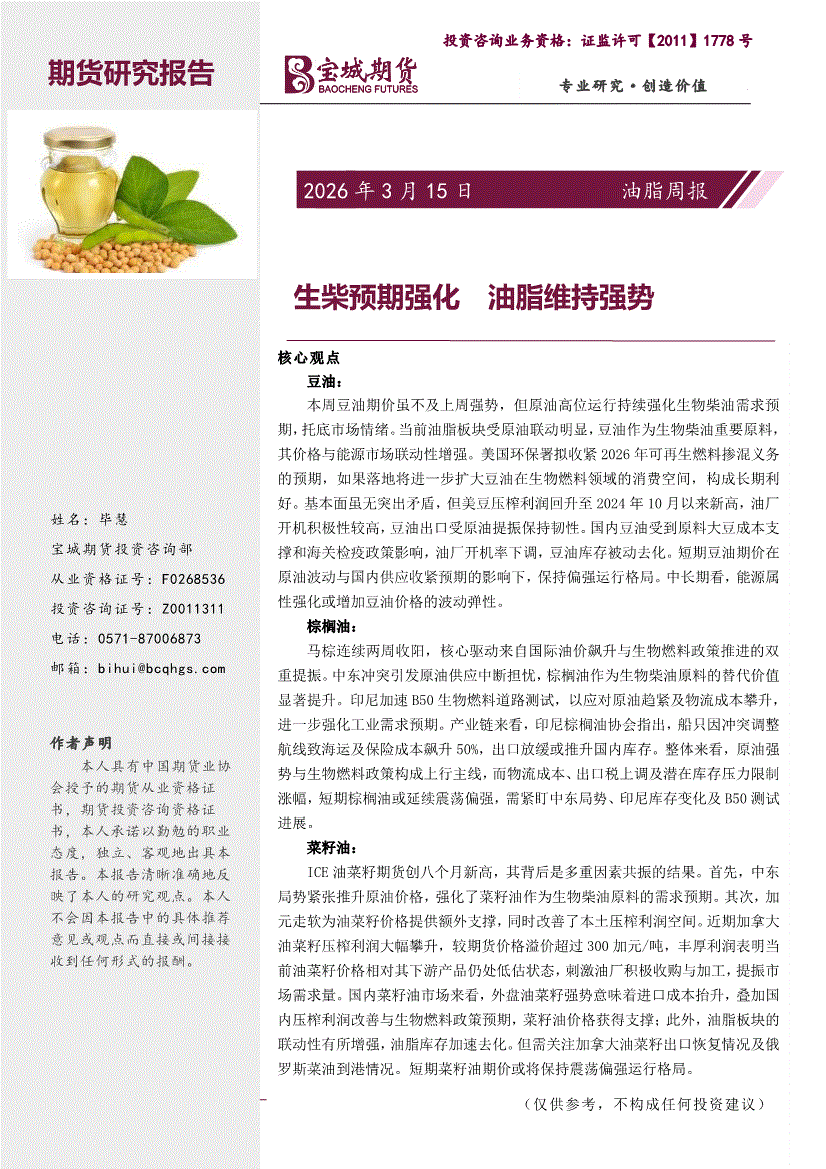 宝城期货-油脂周报:生柴预期强化,油脂维持强势-260315