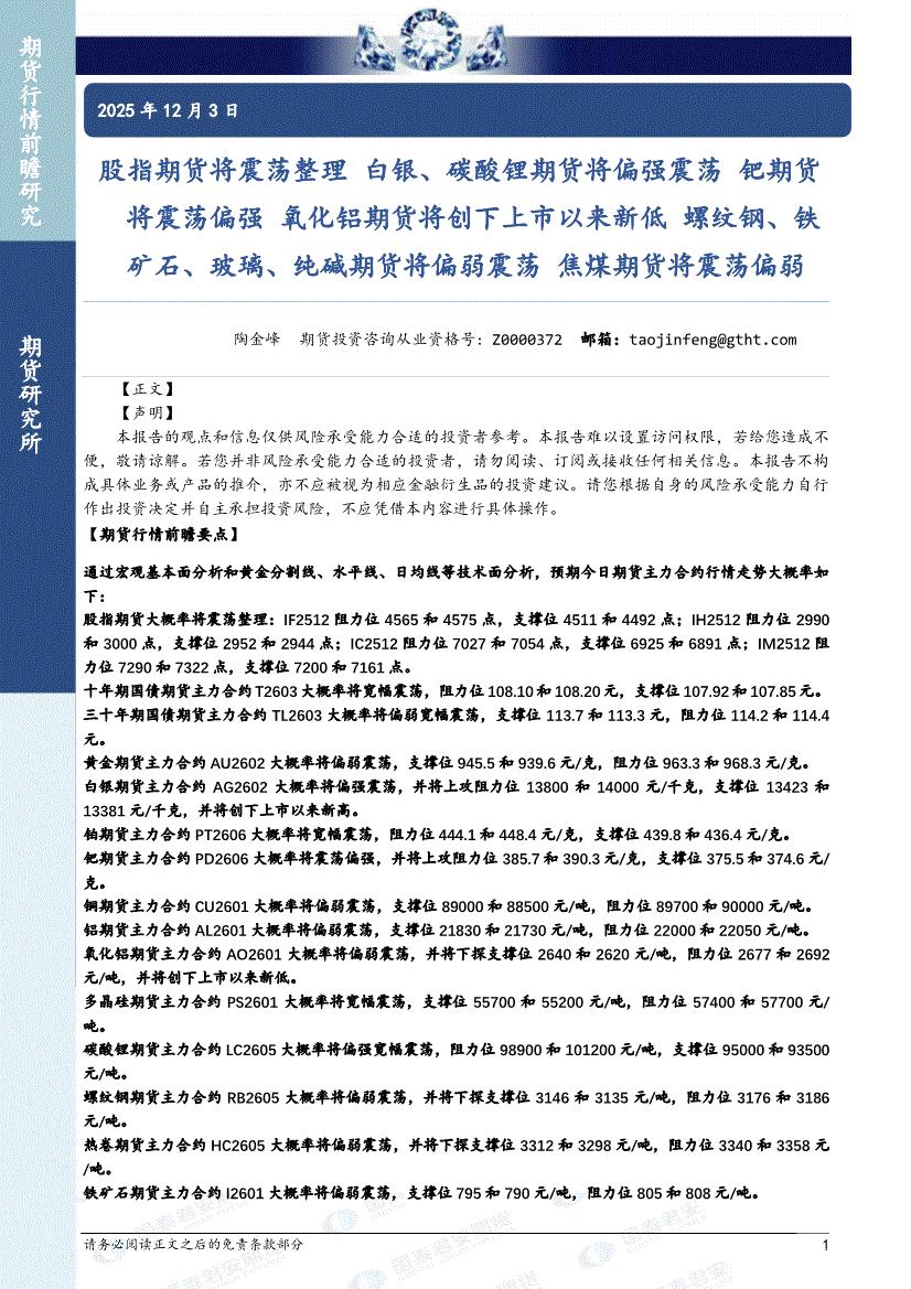 国泰君安期货-股指期货将震荡整理,白银、碳酸锂期货将偏强震荡,钯期货将震荡偏强,氧化铝期货将创下上市以来新低,螺纹钢、铁矿石、玻璃、纯碱期货将偏弱震荡,焦煤期货将震荡偏弱-251203