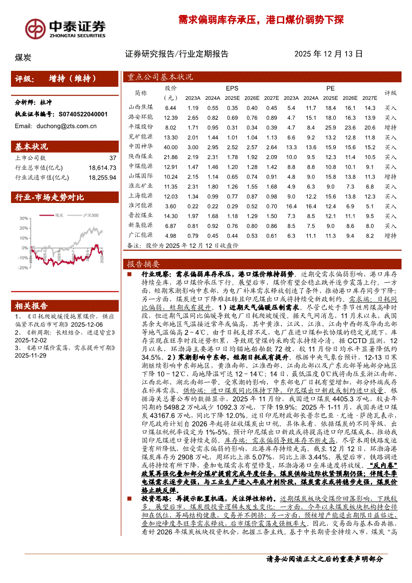 煤炭行业:中泰证券-煤炭行业:需求偏弱库存承压,港口煤价弱势下探-251213