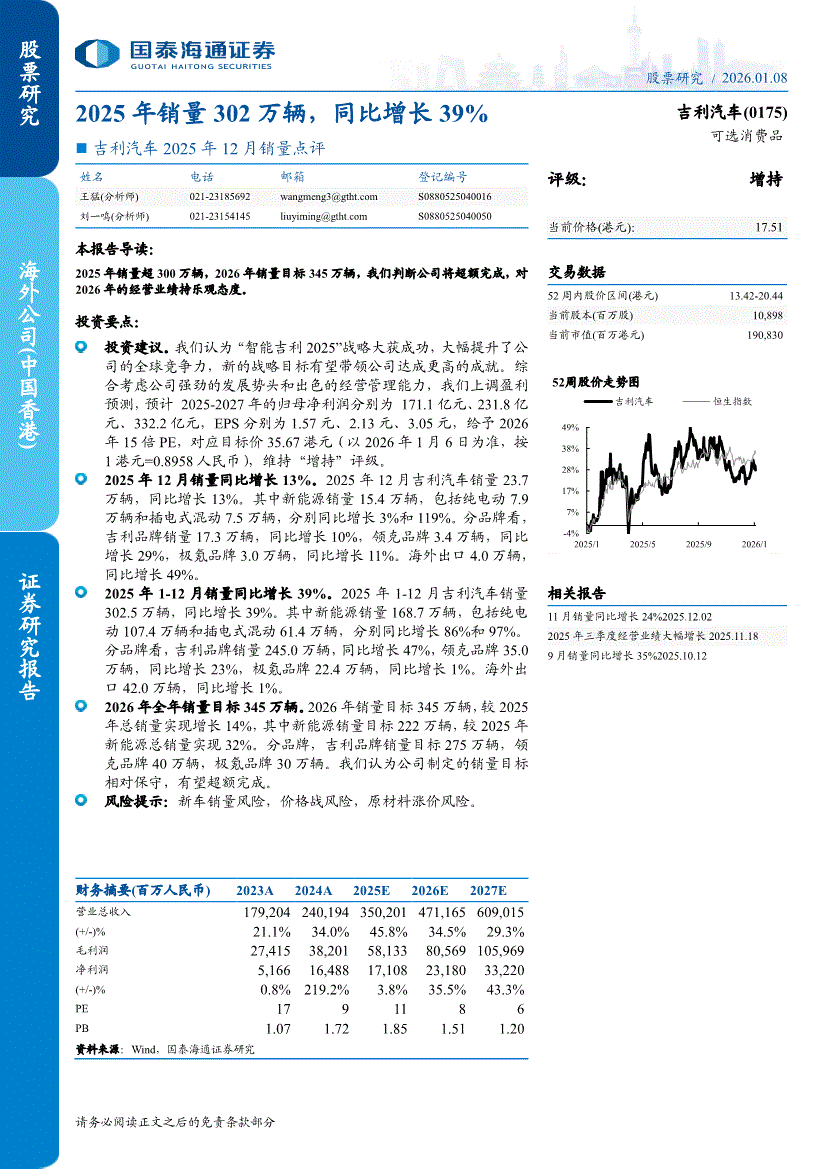 吉利汽车:国泰海通证券-吉利汽车-0175.HK-2025年12月销量点评:2025年销量302万辆,同比增长39%-260108