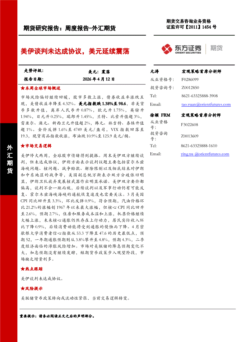 东证期货-外汇期货周度报告:美伊谈判未达成协议,美元延续震荡-260412