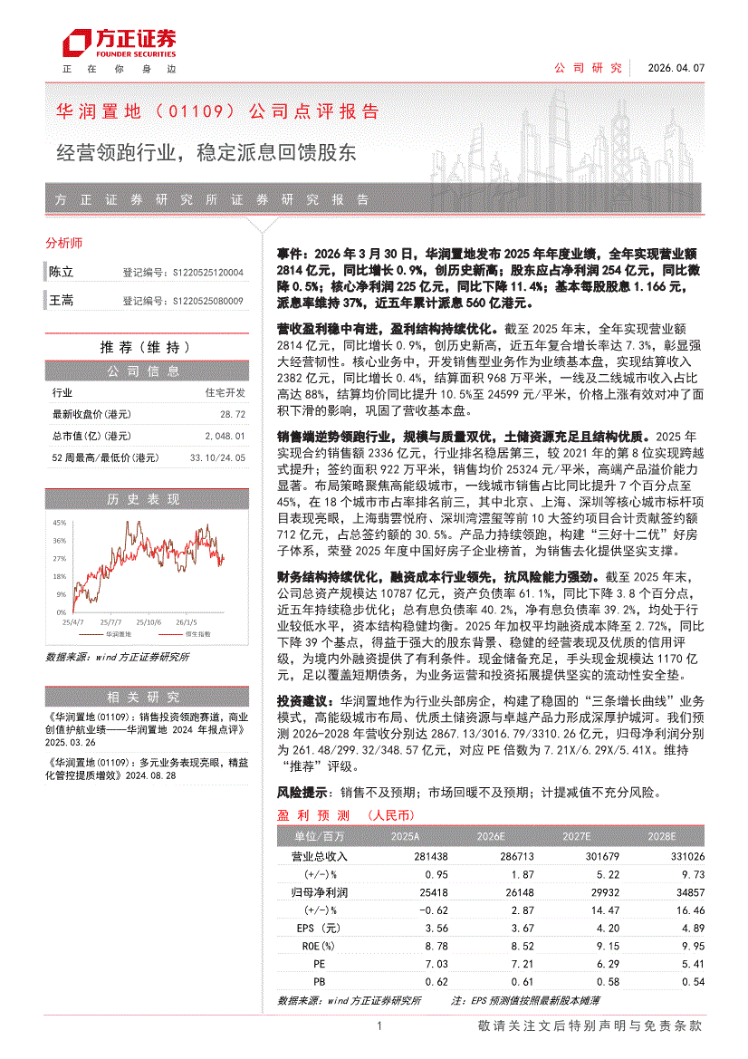 华润置地:方正证券-华润置地-1109.HK-公司点评报告:经营领跑行业,稳定派息回馈股东-260407