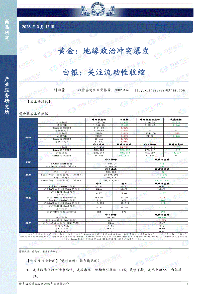 国泰君安期货-黄金:地缘政治冲突爆发,白银,关注流动性收缩-260312