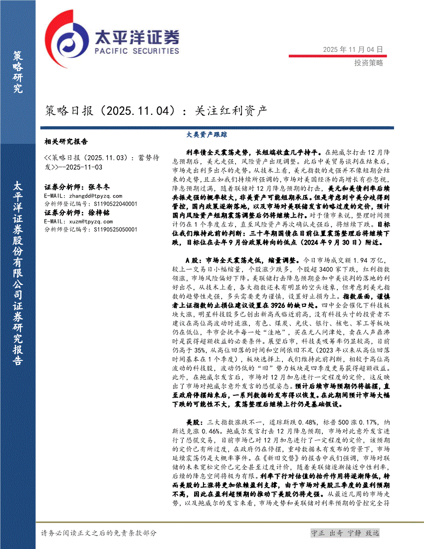 太平洋证券-策略日报(2025.11.04):关注红利资产-251104