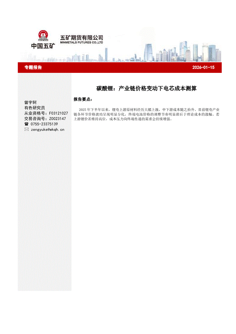 五矿期货-碳酸锂:产业链价格变动下电芯成本测算-260115
