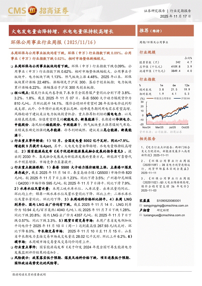 环保公用事业行业:招商证券-环保公用事业行业周报(2025/11/16):火电发电量由降转增,水电电量保持较高增长-251117