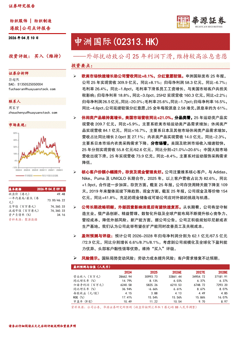 申洲国际:华源证券-申洲国际-2313.HK-外部扰动致公司25年利润下滑,维持较高派息意愿-260410